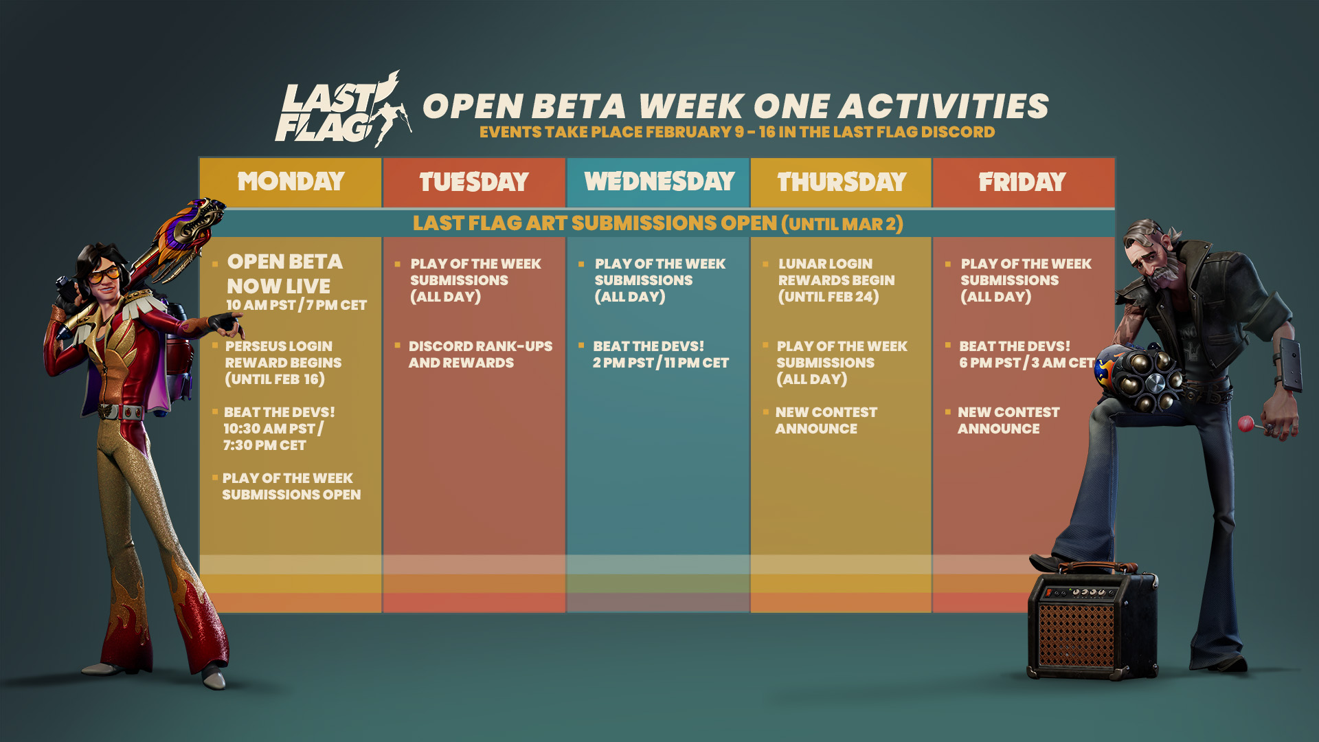 The stage is set, the contestants are geared up, the cameras are rolling, and Last Flag’s Open Beta is officially live! From now until March 2, players across Steam are welcome to dive into our free PC demo to swipe the flag, steal the spotlight, and bring home the glory for their teams. Read on to learn everything you need to know.