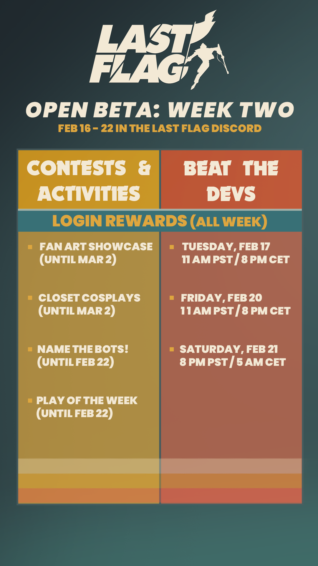 Name the Bots: The player bots in Last Flag have a variety of silly names, but we would love to add even more based on your suggestions! At the end of the week, we’ll select our favorite name ideas submitted by the community and add them to the game in a future patch. Visit the “Name the Bots” thread in Discord to share your name suggestions. Submissions close February 22.